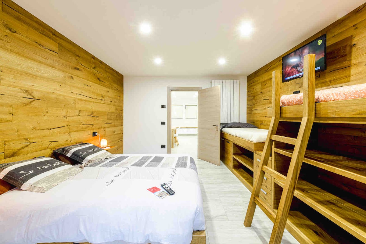 Apartamento con 6 camas con vistas a las montañas. Hay 2 baños, ambos con duchas y bidés. Los espacios comunes no son muy grandes, pero están bien organizados para comer juntos y relajarse. Hay 2 terrazas: una con vistas a la montaña y otra en la parte trasera de la casa con un amplio trastero. A tu disposición sin costo adicional: - ropa de cama y toallas - lavadora - lavavajillas - cama de bebé (previa solicitud) - Wifi Hablamos: italiano, inglés, francés y algunos holandeses