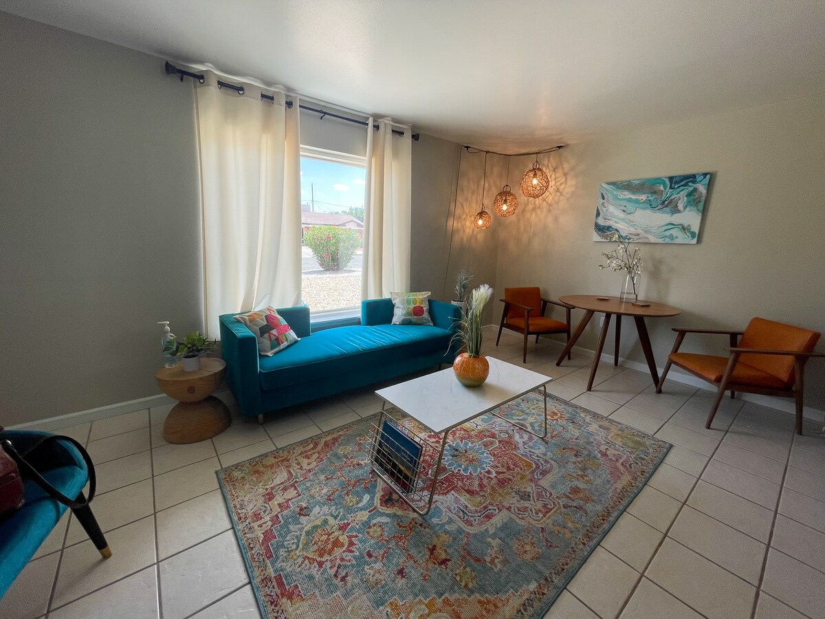 Experimenta la vibrante cultura mexicano-estadounidense y su cálida hospitalidad en esta casa actualizada de concepto abierto. Ya sea que estés en la ciudad para trabajar, relajarte o jugar, esta espaciosa casa de 3 dormitorios/2 baños con sala de juegos, más de 500 Mbps, aire acondicionado refrigerado, suite king y cocina gourmet lo tiene todo. ¡Relájate junto a la mesa de fuego o la pérgola de hamacas en el NUEVO refugio del patio trasero con cancha de baloncesto y pickleball! Cerca de la I-10, el aeropuerto, UTEP/UMC/centro de la ciudad/FtBliss/HuecoTanks/comida/parques/tiendas. ¡Estamos deseando recibirte! ¡Bienvenidos!