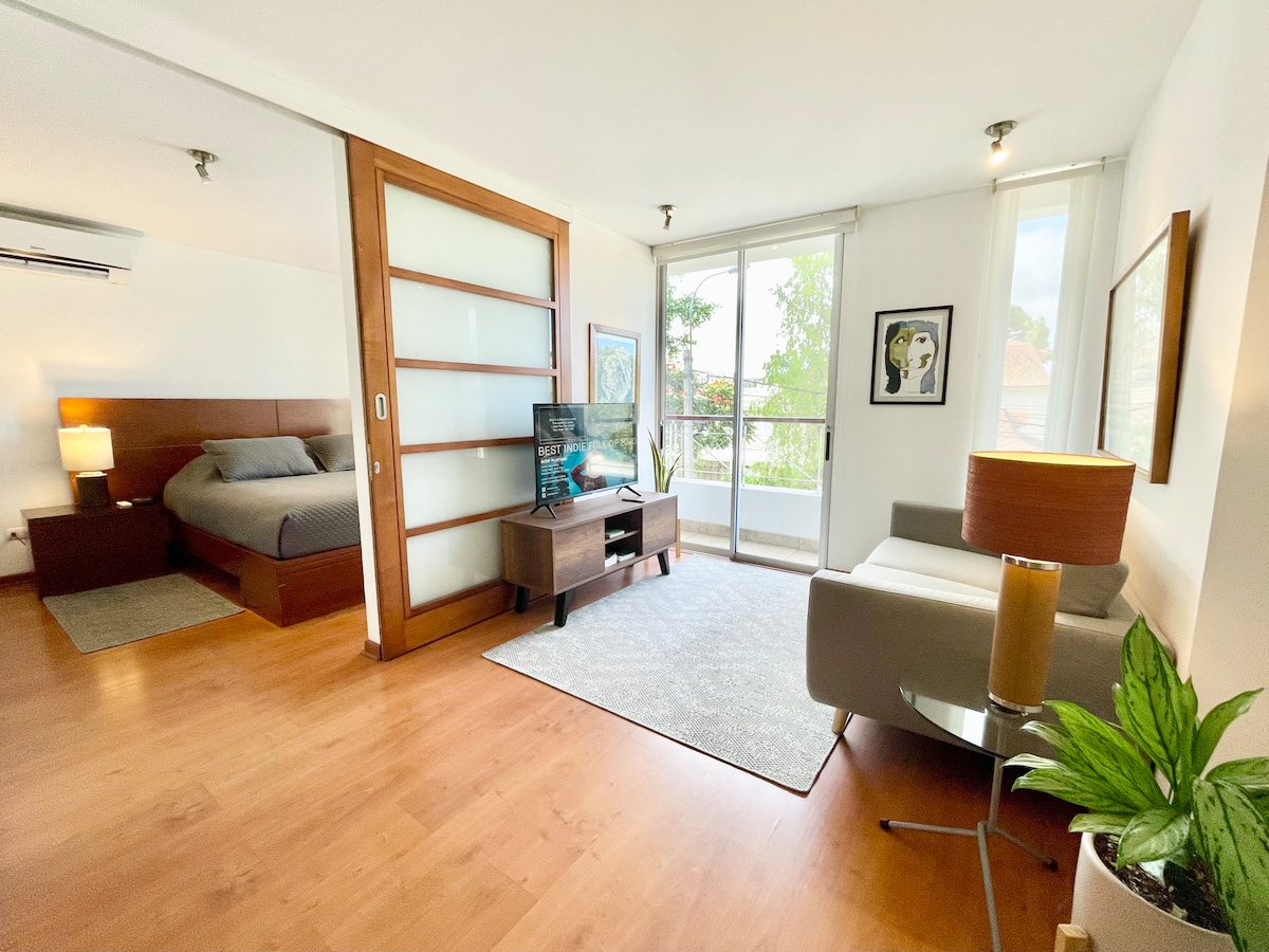 Departamento amplio y elegante en el corazón de Barranco. Ubicación privilegiada: A pasos de los principales puntos turísticos de Barranco y Miraflores, de los mejores restaurantes, bares y galerías de arte. Dormitorio principal: Cama king-size y gran walking closet. Espacio abierto y luminoso: Sala de estar y kitchenette con luz natural. Cochera privada: sujeta a disponibilidad Áreas comunes: Gimnasio, ambiente para reuniones y area de juego para niños. Estilo minimalista.