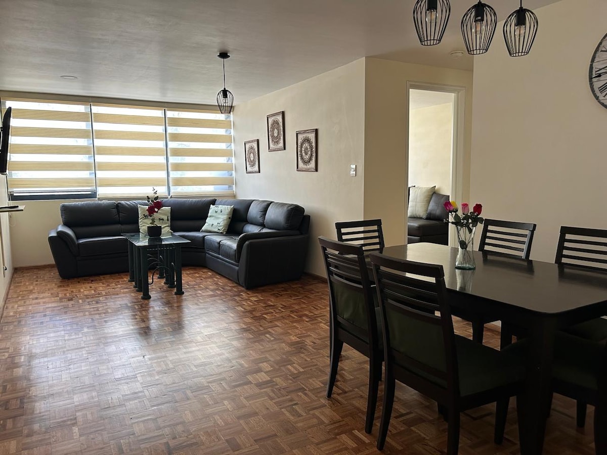 Disfruta de un departamento de mas de 110m2, 2 habitaciones, 2 baños, con estacionamiento propio, cocina equipada, wifi y television por cable en el centro de todo, en un edificio con solo 4 vecinos solo para ti y tu familia. Recién remodelado y Excelentemente comunicado, caminando del barrio de Coyoacan y sus museos, cerca de todo, estación del metro a 2 pasos, trolebús al centro en la mera esquina y Superama a 100 metros