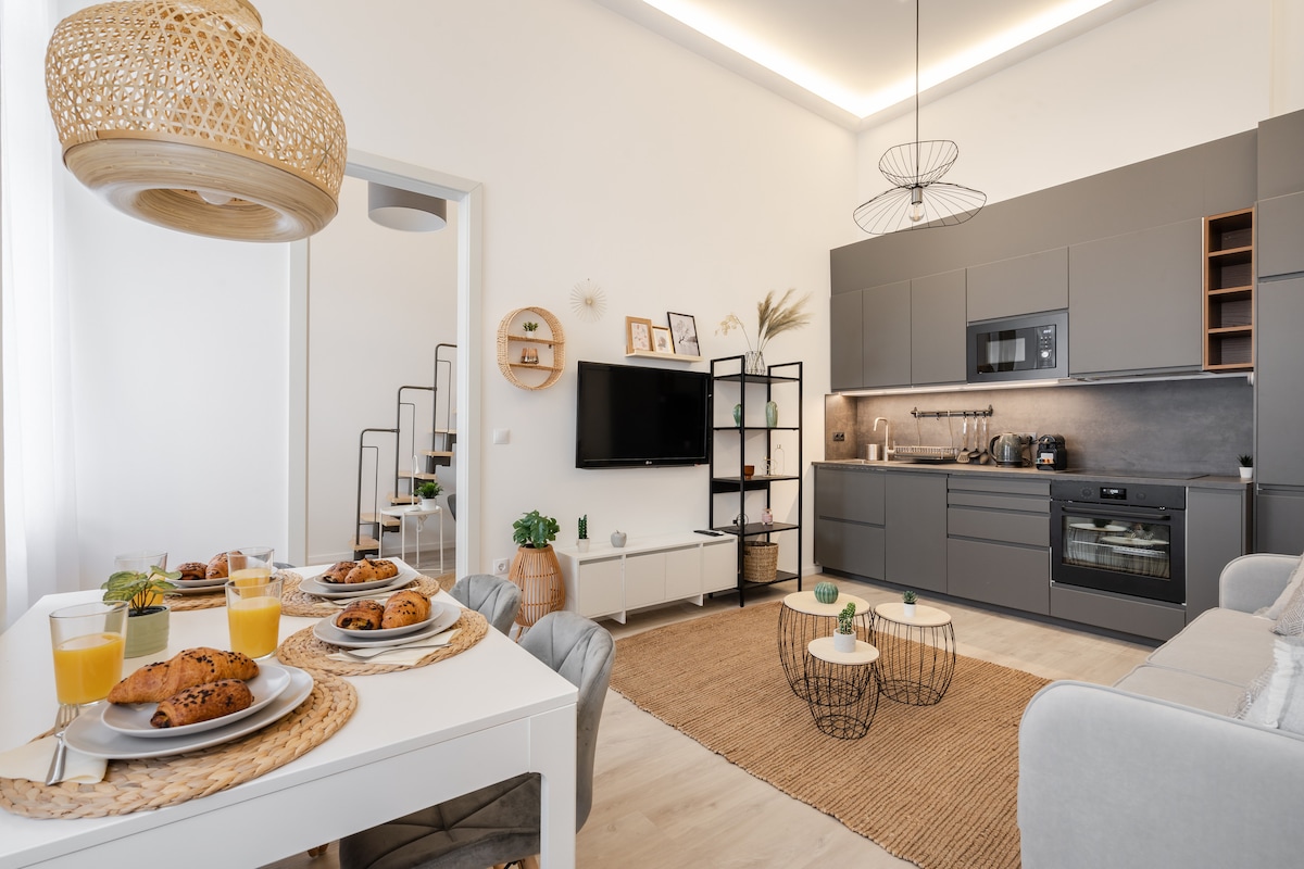 ✨ Impresionante refugio en el último piso en el corazón de Budapest, ¡perfecto para parejas, familias o grupos de hasta 4 personas! Cuenta con un balcón de 4 metros con juego de comedor y tumbona, que ofrece vistas panorámicas desde el castillo de Buda hasta MÜPA. El lujo moderno se une a una ubicación privilegiada cerca del muelle de VIKING CRUISE y el baño Gellért. Totalmente equipado con cama tamaño queen y sofá cama. 🌟