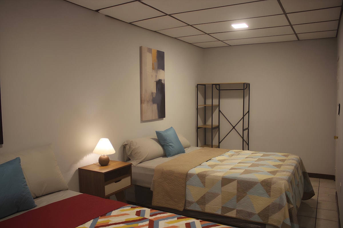 Ambiente acogedor y familiar, cuenta con 2 habitaciones con A/C c/u, 3 camas dobles, cocina equipada, sala-comedor, PRIME Video, 2 baños, lavadora-secadora, plancha y planchador, la ubicación te permite disfrutar diferentes ambientes: a 5min de Plaza Merliot y 7min de parque el principito. En 10 min puedes llegar a centros comerciales como multiplaza, la gran vía y paseo el carmen. El Parque el boquerón y sus restaurantes están a solo 20 min, 40 min de playas y Centro Histórico.