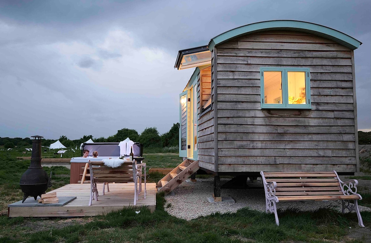 Este refugio rural es la escapada romántica perfecta, a solo 35 minutos en taxi/tren de Londres. Relájate en tu jacuzzi privado de lujo, disfruta de una botella de champán bajo las estrellas y despierta con vistas impresionantes de campos ondulantes y vida silvestre. Nuestra cabaña de pastor artesanal combina el encanto rústico con la comodidad moderna, que ofrece una cama tamaño king para observar las estrellas, una acogedora terraza iluminada por el fuego y un baño de lujo, todo ubicado en un prado tranquilo.