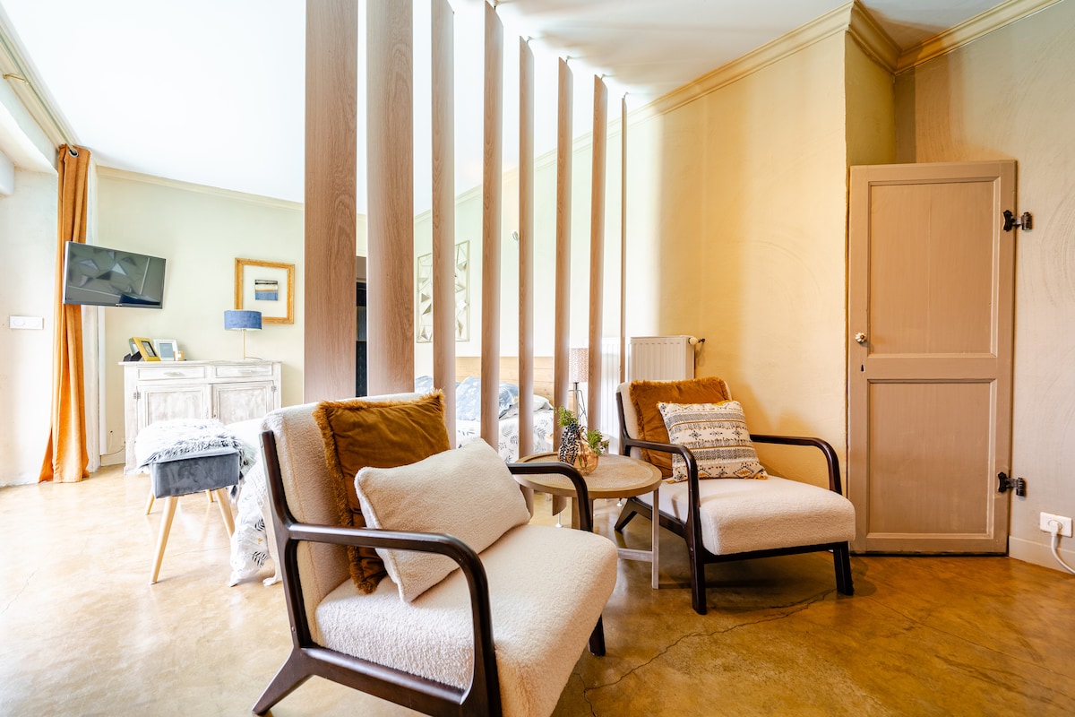 Disfrute de un alojamiento elegante y nuevo clasificado con 1*. El estudio se encuentra al final de un callejón sin salida a dos pasos del centro de la ciudad, cerca de varios accesos. Consta de un sofá cama de 140x200 con un cómodo colchón y dispone de un baño con una pequeña ducha. Se proporcionan sábanas y toallas. Un aparcamiento gratuito cercano está a su disposición para facilitar sus desplazamientos y estacionamientos diarios. Para cualquier información, no dude en ponerse en contacto conmigo.