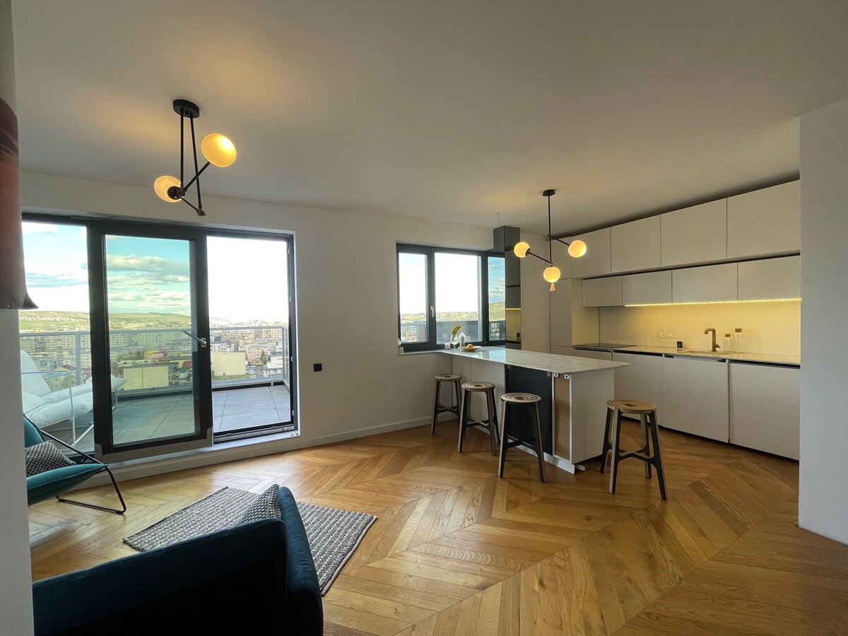 El apartamento está ubicado en el edificio Viva City Residence, cerca de parques y maravillosas vistas, a 100 metros del centro comercial Iulius. Te encantará esta casa porque tiene un ambiente agradable, la terraza con una hermosa vista, única y no olvidemos la cama muy cómoda. El lugar es bueno para parejas o viajeros de negocios. Tienes wifi incluido, cocina completa, cafetera espresso Nespresso y TV LCD de alta definición con canales por cable y Netflix. Te estoy esperando