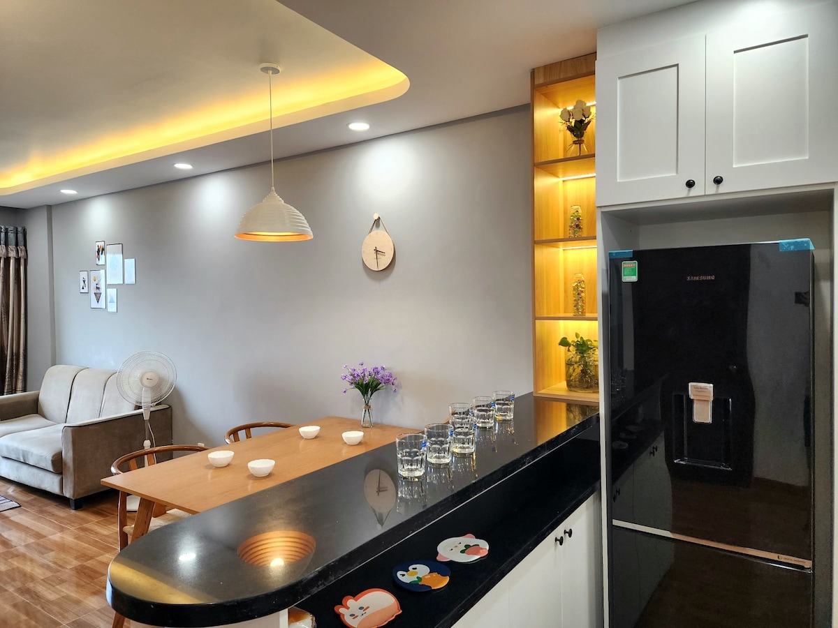 Moderno apartamento de 2 dormitorios con vistas increíbles al río para personas, familias o grupos. A 50 metros, se puede ir andando fácilmente al cine Lotte en TNL Plaza, a Starbucks, al supermercado, etc. Ofrecemos un excelente servicio con todo lo necesario para tu viaje, como: - A 5 minutos de los distritos 1, 2, 3, 5, 7 y 8. - 2 dormitorios con 2 baños. - Cocina totalmente equipada. - 3 aire acondicionados. - Lavadora y nevera, hervidor de agua rápido. - Wifi y TV de pantalla plana TCL de 43 pulgadas. - Champú, toallas, secador de pelo, etc.