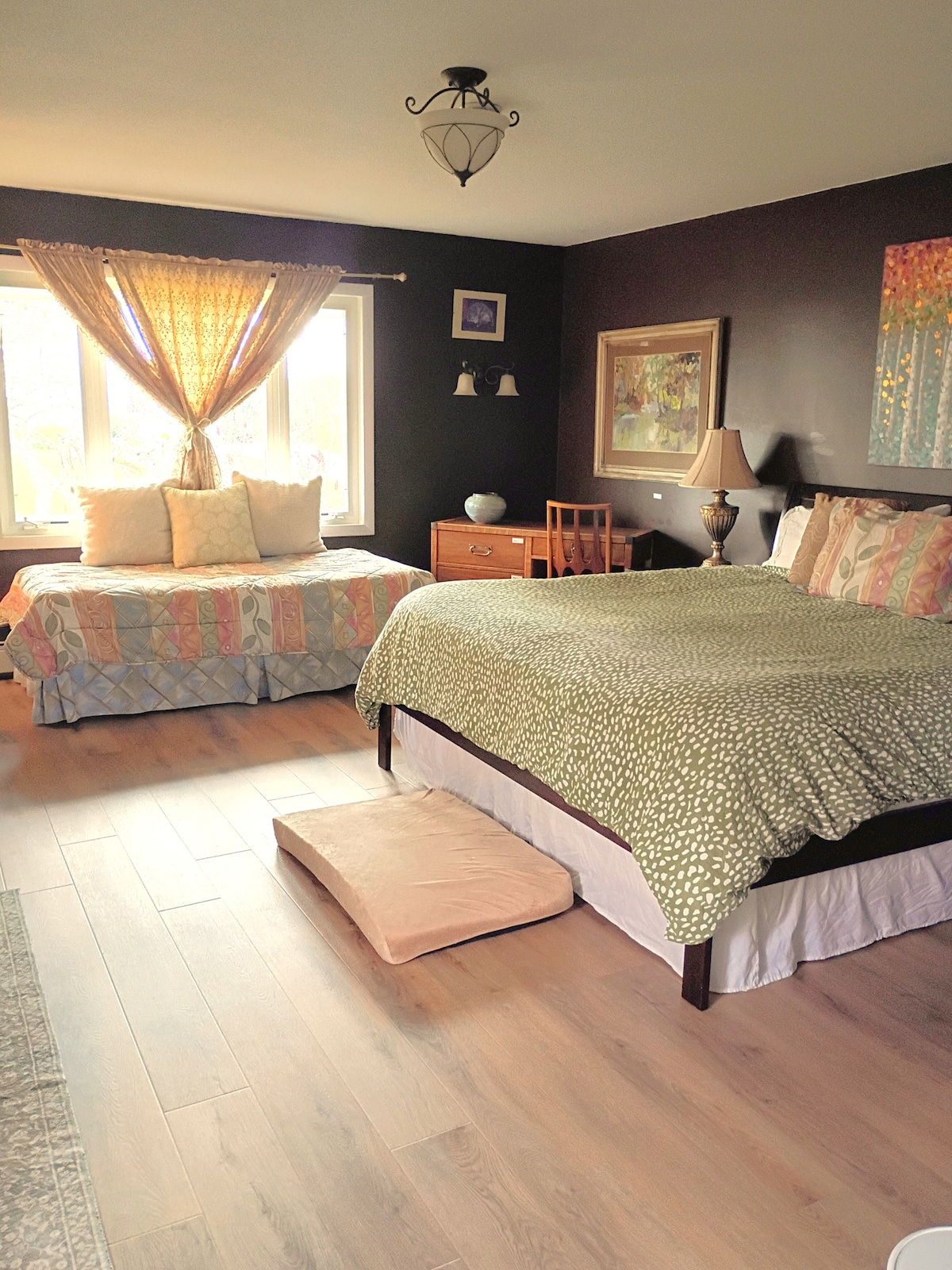You'll love it here! Since 2021, the Chocolate Room has delighted travelers seeking a quiet, private escape. Lose your tension with a luxurious pillow-top king bed and a cozy Jacuzzi tub. Enjoy easy walking access to lake, parks, woods trails, the bike path + a private neighborhood beach, just 15 minutes from downtown Burlington or Winooski. There's easy off-street parking, fast wifi and a big grassy yard for dogs. (We ❤ pets!) Coffeemaker, breakfast nook, locked garage for your gear.