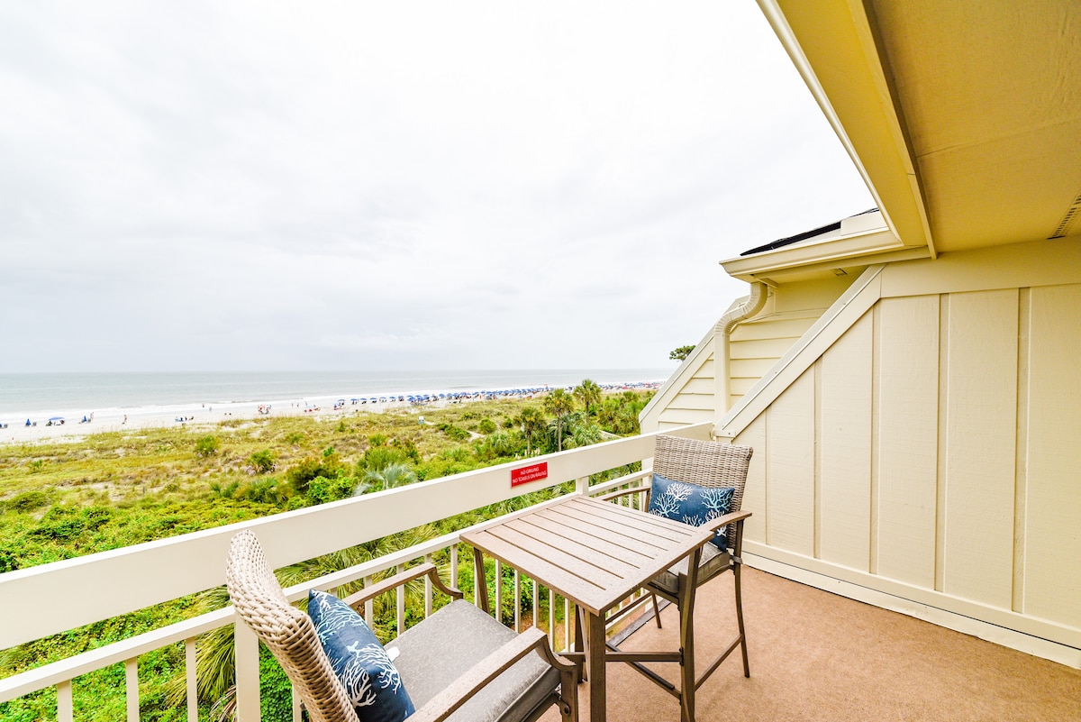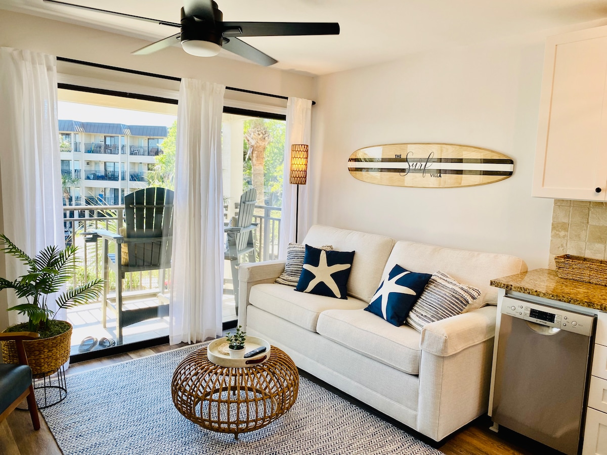 Retiro bellamente renovado con vista al mar, perfecto para una escapada romántica o una pequeña escapada familiar. Disfruta de una cama tamaño king, un sofá cama tamaño queen, pisos de baldosas de madera a la deriva, electrodomésticos de acero inoxidable, paredes de shiplap y puertas de granero que agregan encanto y privacidad. Disfruta de impresionantes vistas desde tu balcón privado, relájate con sillas de playa incluidas o explora la isla en dos bicicletas de cortesía. Camina hasta tiendas, restaurantes y entretenimiento: todo lo que necesitas para disfrutar de una estancia inolvidable en Hilton Head.
