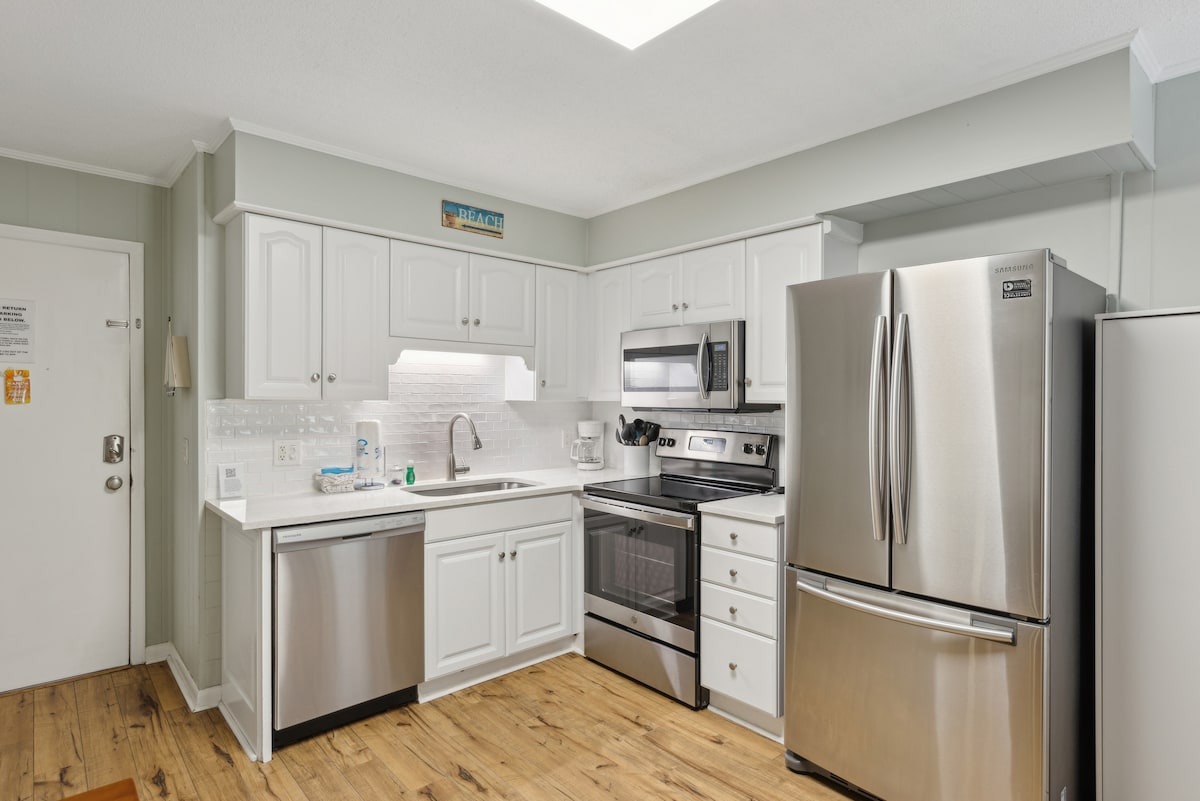 Siéntete como en casa en este cómodo apartamento de 2 pisos en la planta baja. A poca distancia a pie de la playa. Concepto abierto de salón, comedor y cocina totalmente equipada y 1/2 baño en la planta principal. Elige el cómodo dormitorio tamaño king o queen con ducha a ras de suelo o bañera de tu elección. Patio privado con parrilla y asientos al aire libre. Todo esto, en un entorno de azaleas, palmeras y a 20 pasos de la piscina con tiendas y restaurantes a solo 2 manzanas de distancia. Ten en cuenta que solo hay 1 plaza de aparcamiento disponible para tu estancia.