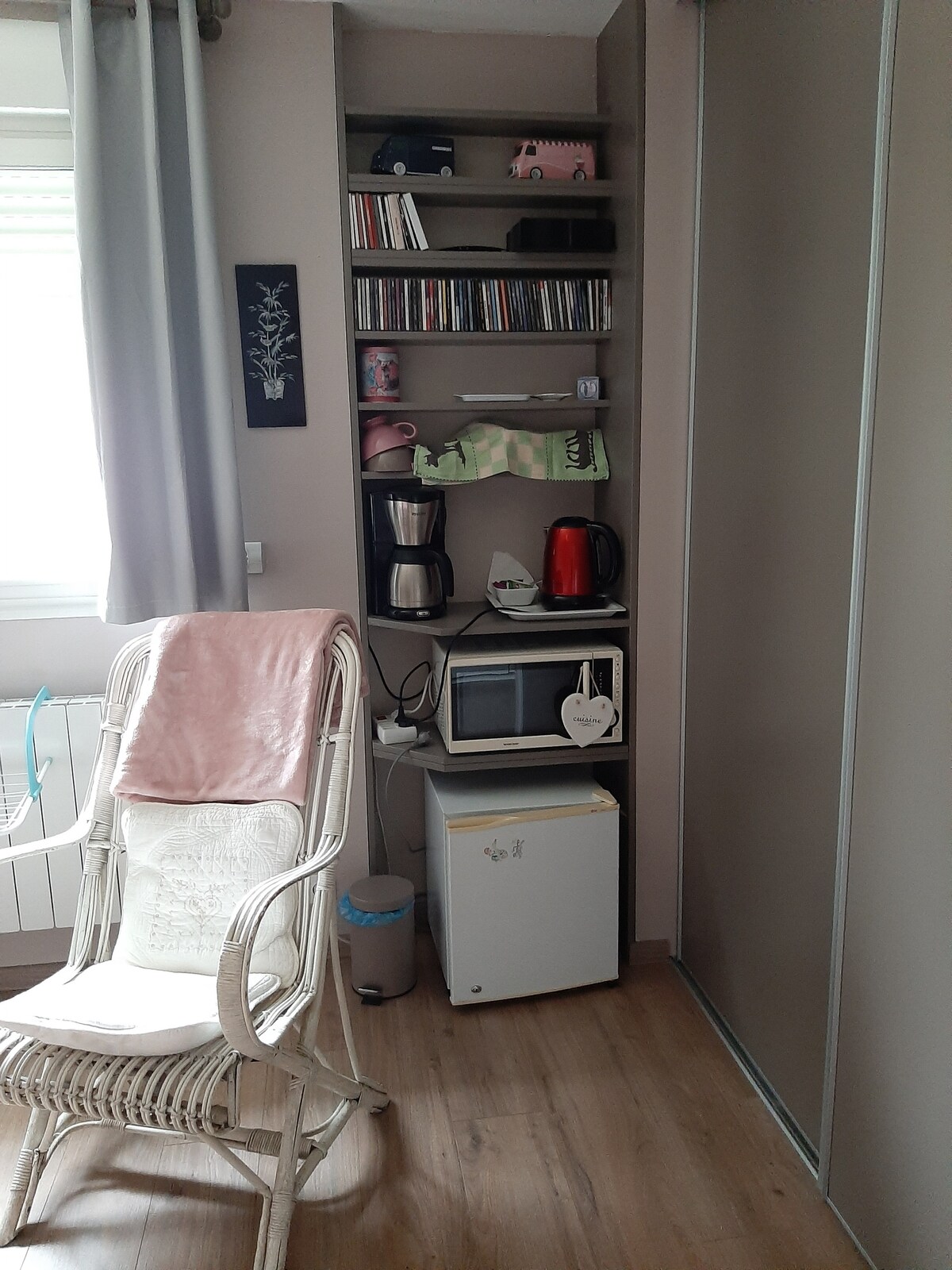Casita de 28 m2 con terraza construida en el fondo de nuestro jardín. Es un pequeño alojamiento amueblado para 2 adultos (cama doble en el dormitorio) + 2 niños pequeños (banco nido en el salón). Se encuentra cerca de las principales carreteras en una zona residencial tranquila. El centro de Caen está a 3,5 km (castillo).