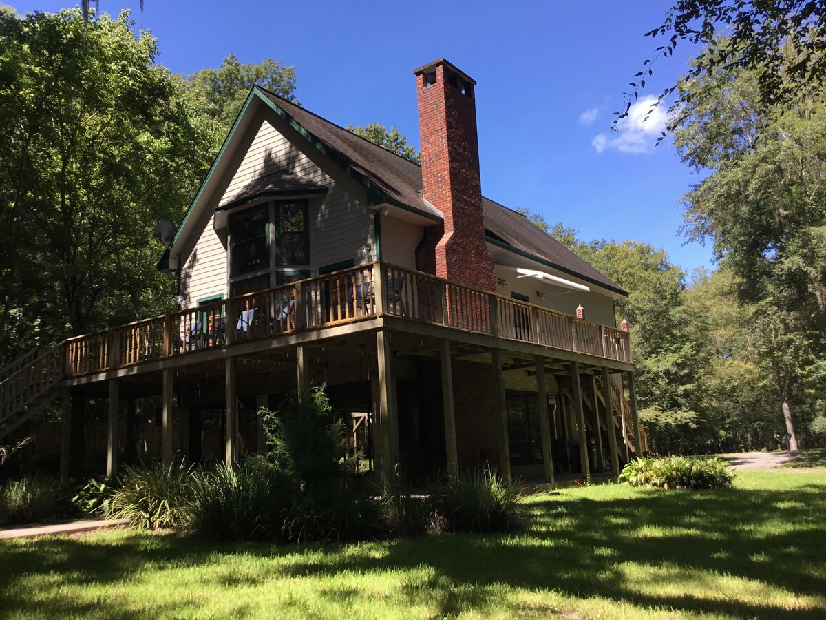 Pasa todo el tiempo que quieras en casa, en la naturaleza, relajándote o recreándote. Esta casa árbol única se encuentra en lo alto de los árboles y en 13 acres de hábitat natural a orillas del río Santa Fe. El Santa Fe tiene mucha vida silvestre, y estamos cerca del famoso río cristalino Ichetucknee y millas de senderos públicos. Compartimos nuestros kayaks, una canoa y muchas comodidades para tu estancia. Así que ve a remar en solitario, únete a los viajes de guías locales a varios manantiales o haz senderismo en la propiedad y en los parques cercanos.