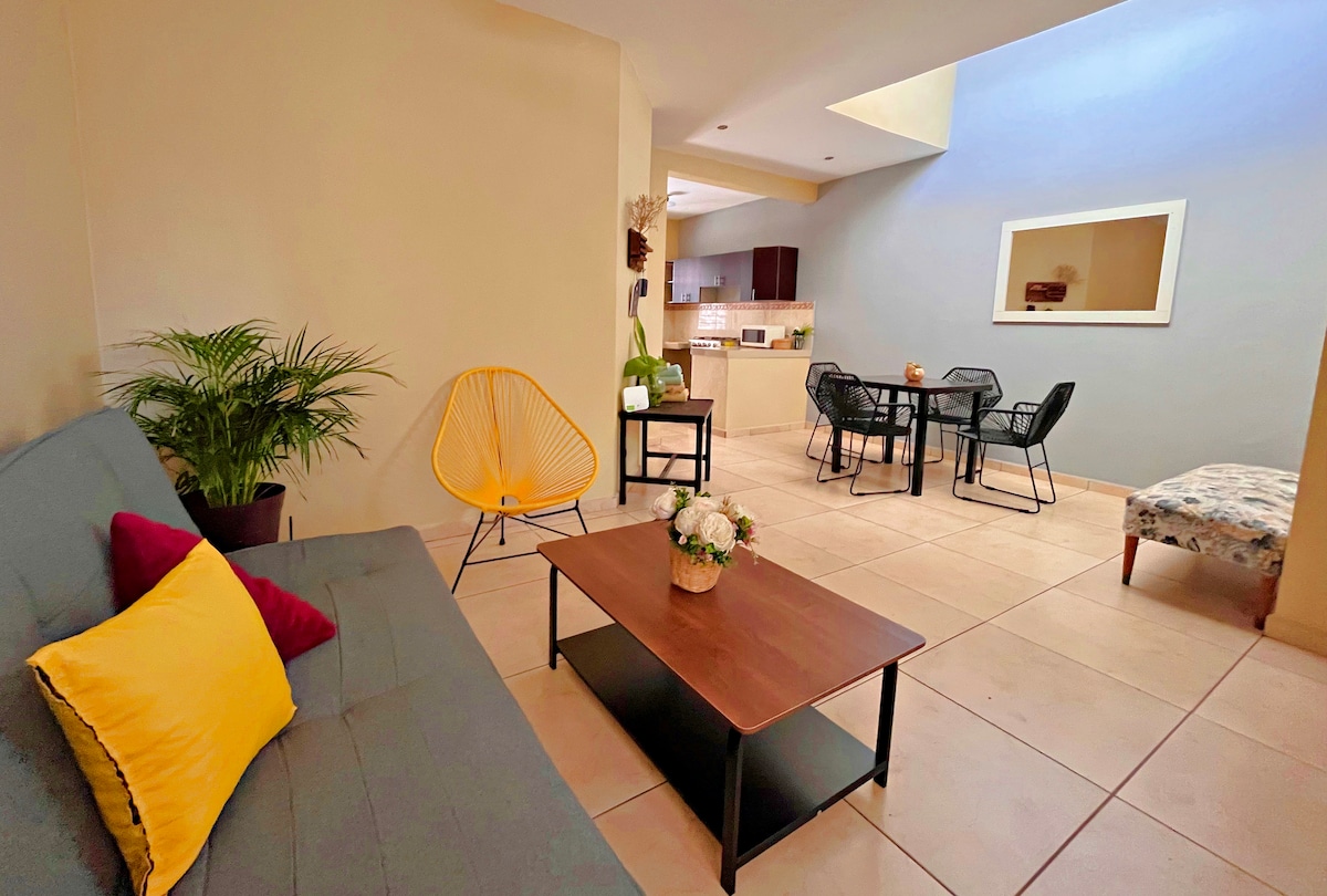 Espacio ideal para trabajo y descanso. Con todo lo necesario para estancias largas y cortas. Ubicada en zona residencial con todos los servicios cercanos, OXXO, fruteria, y tiendas. A 2 cuadras de avenida principal. Cuenta con 2 habitaciones y 4 camas individuales que se convierten en king size; con aire acondicionado y ventiladores para mayor frescura. Televisión con ROKU para que puedas ver todas tus series y programas. WIFI de alta velocidad. Cocina equipada, lavadora, estacionamiento.