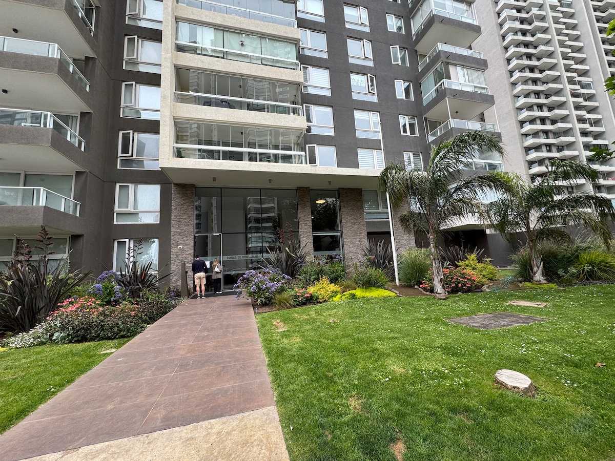 Departamento en piso 8 de dos dormitorios, con vista al mar. Ubicado en sector Costa de Montemar. Cercano a comercios, supermercados, restaurantes. Piscina temperada, piscina al aire libre, gimnasio, sala de juegos, quinchos. Wifi, TV por cable , ropa de cama, toallas. The Apartment in the 8th floor, with ocean view. Located in Costa de Montemar. Close to shops, supermarkets and restaurants. Outside pool, heated pool, gym, play rooms, BBQ area. Wifi, Netflix, bed-clothes, towels.