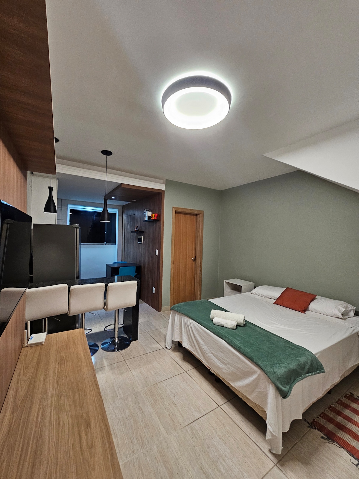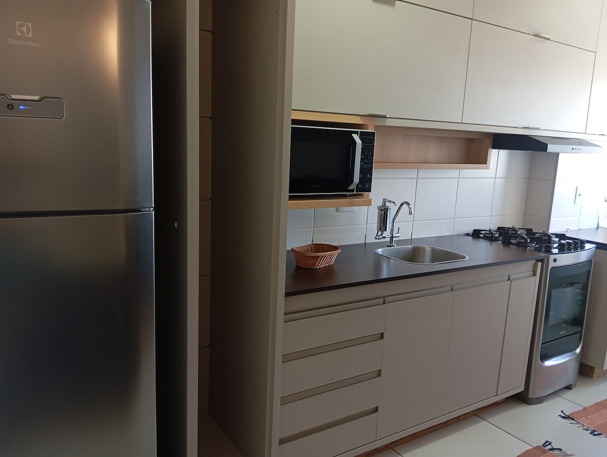 Relájate en este espacio tranquilo y con estilo. Hola, soy tu anfitriona. Vamos a conocer un poco del espacio que he dejado especialmente para ti. Espacio con un toque moderno. Completamente diseñado en un alojamiento acogedor. Cuenta con TV de 42 pulgadas, con Wi-Fi, YouTube, Netflix, Globo Play y mucho más. ¡Sofá cama para que te sientas como en casa viendo tu serie favorita! Cocina completa con todo lo necesario para preparar lo mejor, lavadora y secadora.