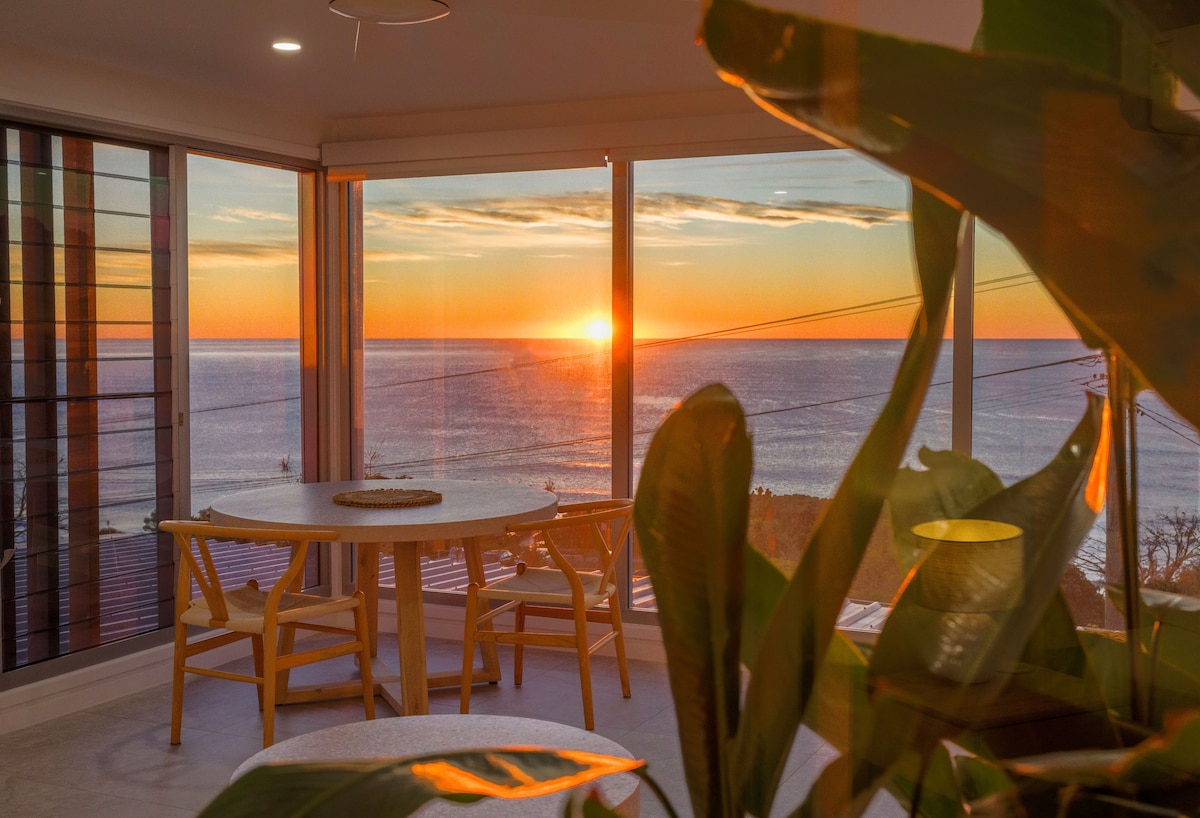 Apartamento romántico frente a la playa con vistas panorámicas a las bahías de Coolum. Disfruta de los amaneceres sobre el océano, sumérgete en la bañera mientras las olas rompen o disfruta de un café en tu balcón privado sobre el oleaje. Perfecto para unos días de relax junto al mar, este moderno refugio de diseño abierto combina lujo y comodidad en un entorno costero tranquilo. Pasea por el pintoresco paseo marítimo, explora playas escondidas y date una vuelta por las cafeterías locales. Relájate en la arena de First y Second Bay, a pocos pasos de tu puerta.