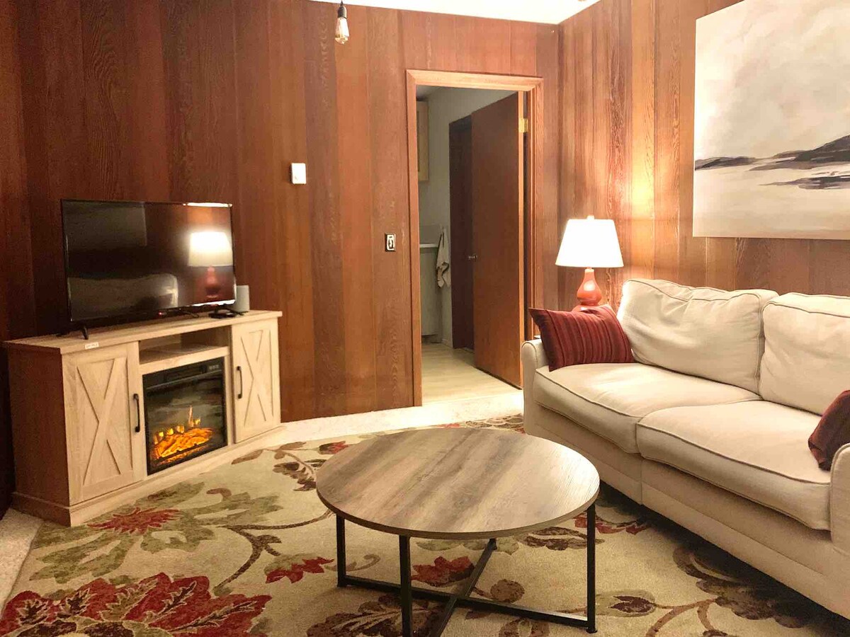 Apartamento en la planta baja, azulejos y alfombra, totalmente amueblado con cama tamaño queen de fibra de bambú orgánico. Cocina completa equipada; cocina, nevera, con licuadora, cafetera francesa y horno tostador. Utensilios de cocina, cuchillos, utensilios, hilador de ensaladas y más. Sofá reclinable en la sala de estar. Una zona para una computadora. 43pulgadas para streaming. 30 ”en el dormitorio. Al norte de la ciudad a 1 milla. Necesitarás un auto. Wifi muy rápido, 457 mbps. Bosque alrededor de… alfombra nueva (2022)