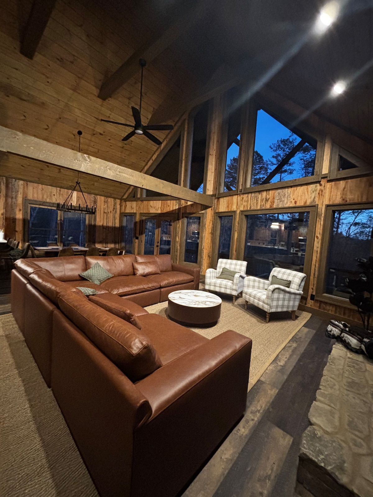 Relájate y desconecta en nuestra cabaña de nueva construcción rodeada de bosque y un lago mineral que atrae ciervos, aves y otra vida silvestre. Esta cabaña rústica contemporánea tiene una cocina totalmente equipada, dos cómodos dormitorios con baño privado con camas tamaño king y una cama tamaño queen extraíble. Los placeres interiores incluyen una selección de juegos, una chimenea de gas, un televisor Roku HDTV de 65 pulgadas y una guitarra Martin. Una espaciosa terraza al aire libre con chimenea de leña, TV Roku HDTV de 65 pulgadas, parrilla de gas, amplios asientos al aire libre y un jacuzzi de 6 plazas.