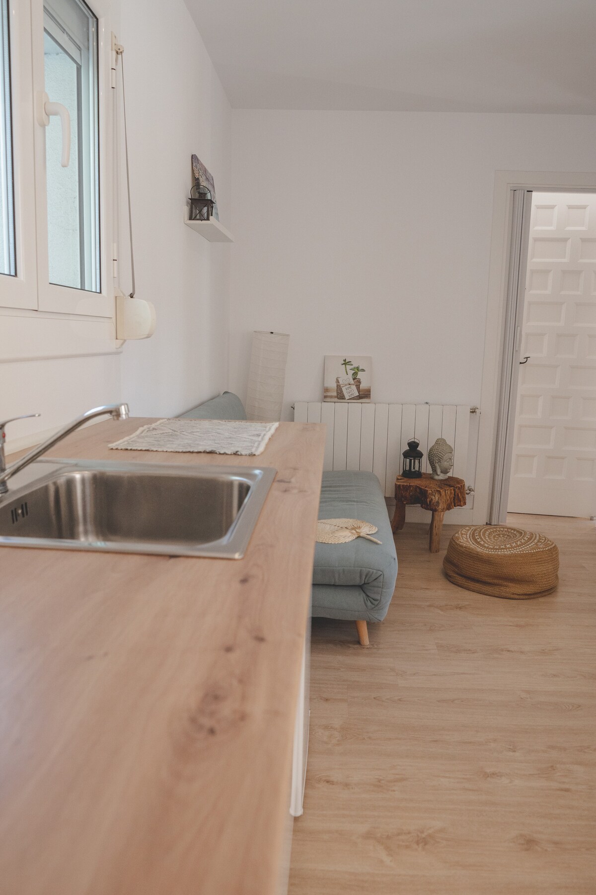 Es un departamento independiente que se encuentra en la primer planta de una tranquila finca con muy pocos vecinos. Se accede desde la calle por escalera. Está formado por un espacio de 33 mts 2 con cocina integrada al salón , vestidor y baño. Posee también un dormitorio doble al cual se sube por escalera interior, y que brinda acceso a una terraza de 25 mt 2 con vistas a la montaña. Una luz natural que ilumina todo el piso