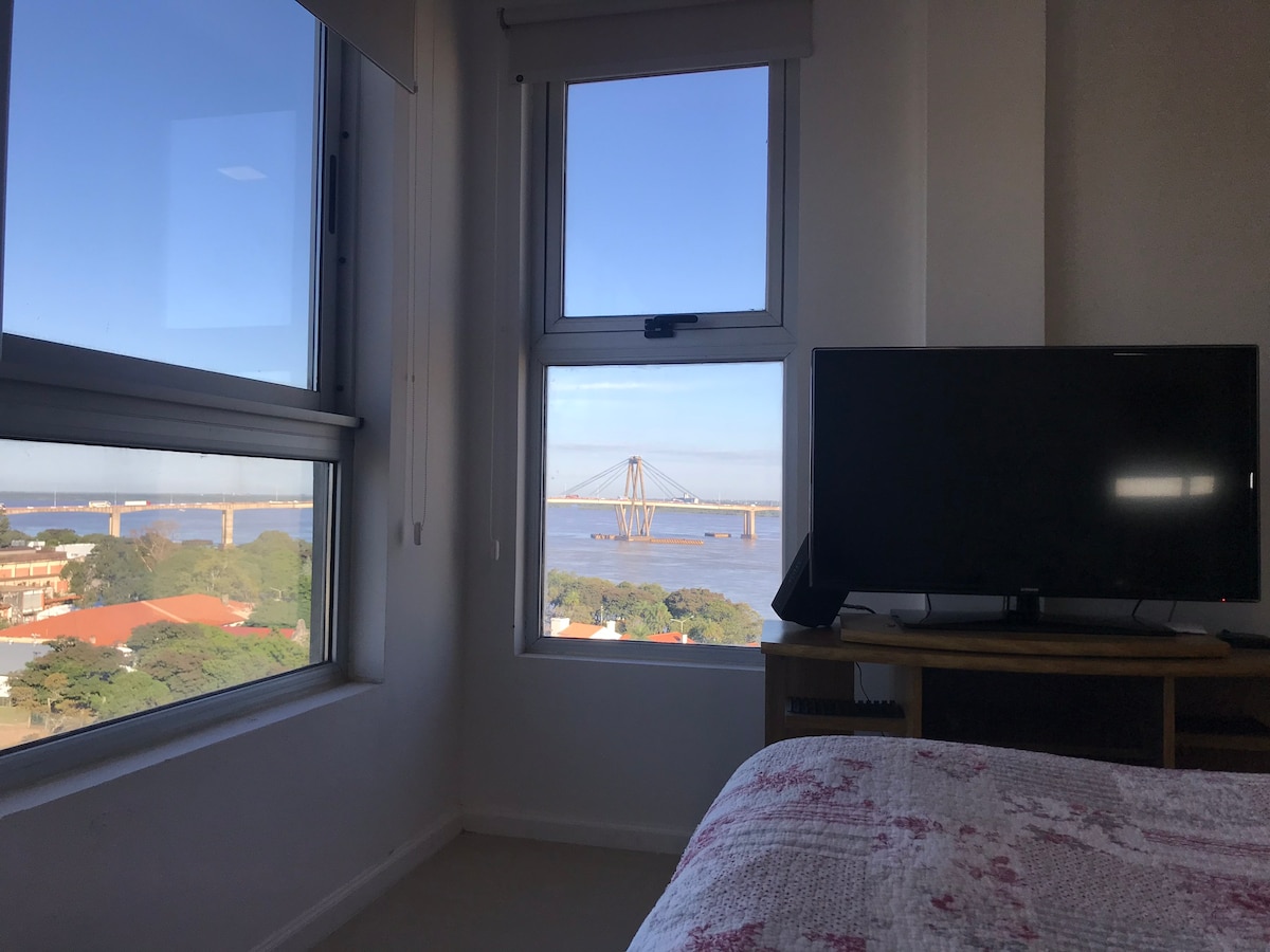 El apartamento se encuentra en el piso 12 del edificio el Tigre. Ubicado en el barrio Camba Cua a pocos metros de la costanera, el puente general belgrano y el río Paraná. Cuenta con 2 ambientes , el living/ comedor es muy amplio con una mesa , aire ,sillón y tv 55’. La habitación cuenta con cama matrimonial amplia , aire y tv 40’.