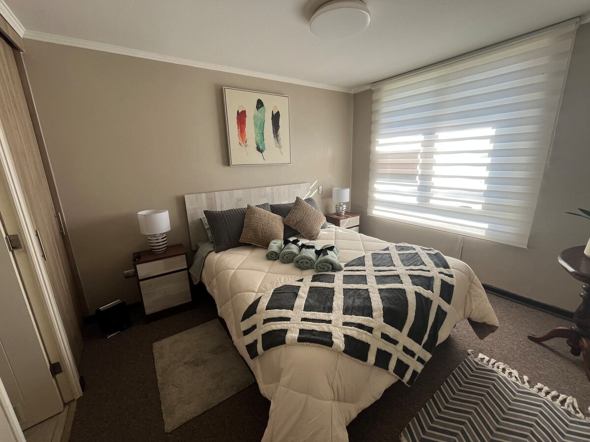 Enjoy this quiet and comfortable accommodation in Penco. Cozy, bright, and modern. A few blocks from the community's beach, gastronomic centers and the waterfront. Transportation just one block away and parking located inside the condominium. Two bedrooms 1 Double bed 1 Single bed 1 Sofa bed (futon) for 2 people Access without climbing stairs. Outdoor children's play area. It has everything you need to make your stay an excellent experience.
