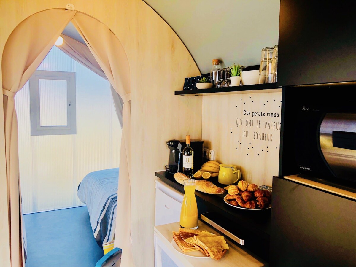 Carretilla construida por nosotros con una estética inspirada en un submarino. Con una cama de 2 plazas en el altillo (acceso por escalera) y 2 bancos que pueden servir como camas supletorias para 2 niños. Nota: - estanque muy cerca = ¡peligro real para los niños pequeños! - no accesible PMR - inodoro seco - cabina de ducha - cocina equipada - playa a 10 minutos a pie (11 playas en la península)