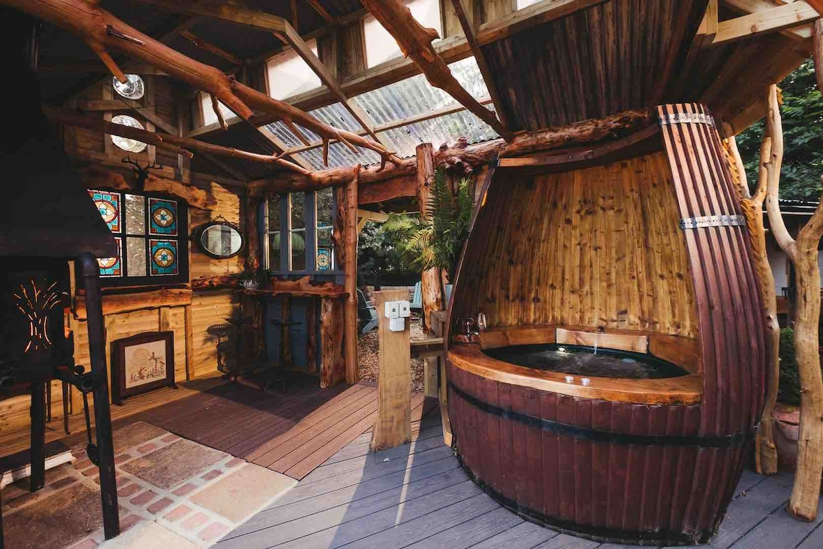 ¡Un vagón acogedor y un jacuzzi en un barril de vino gigante! Ubicado en el campo de Hampshire. Las características en el interior incluyen una cama doble, baño con puerta de trampa, inodoro y una gran ventana de "rueda de vagón" con impresionantes vistas. Al aire libre se encuentra el Wild Cherry Barn con chimenea de chimenea y una zona de estar de salón con horno de pizza y fogata con barbacoa. The Wagon in the Woods es un pequeño lugar independiente en el campo con un bosque privado, ideal para aquellos que desean una escapada tranquila y relajante.