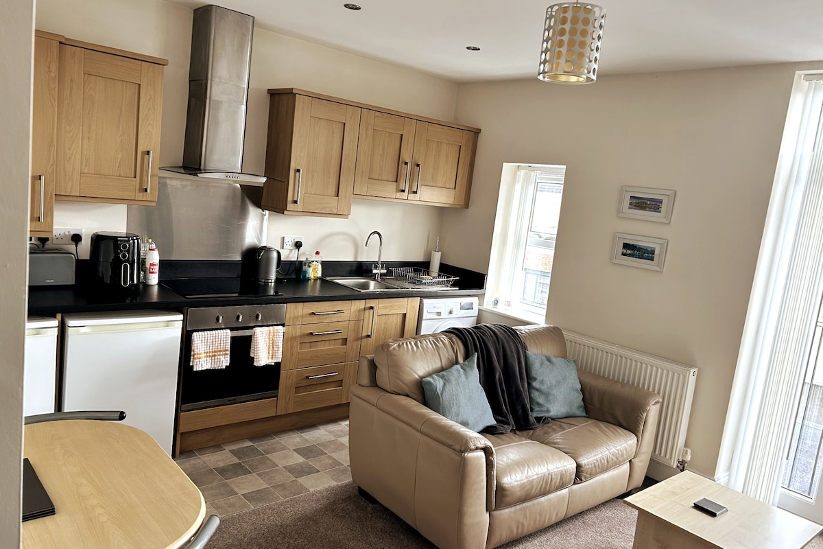 Contemporary, purpose built, one bedroom apartment. The apartment has been lovingly developed & decorated to offer a welcoming, bright & airy space, ideal for long or short term stays offering: - semi open plan lounge with TV, free wifi, dining table for 6 and comfy couches - fully fitted kitchen with dishwasher, washer dryer and fridge freezer - king size bedroom with leather sleigh bed & fitted wardrobes - bathroom with shower, shampoo, conditioner & shower gel, fluffy towels and bathrobes