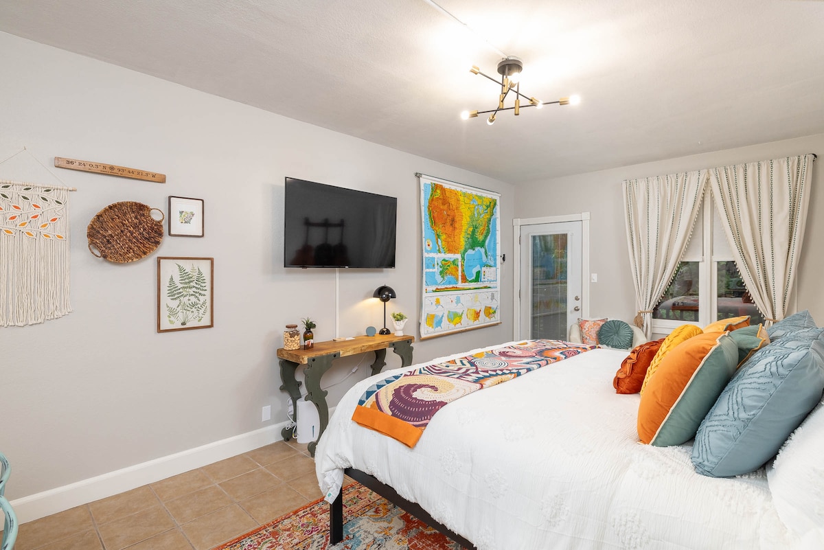 Departamento Luxury Spring Street situado en el centro de Eureka Springs. Las escaleras de madera conducen al apartamento privado, ubicado a un nivel por debajo del nivel de la calle. La suite está pensada como una escapada privada de lujo, que muestra obras de arte originales, con una cama tamaño king, cocina completa, lavadora/secadora, jacuzzi y baño de lujo con ducha a ras del suelo. Ya sea que decidas recorrer el centro de Eureka Springs o disfrutar de la vista de Cristo de los Ozarks desde el patio privado, este apartamento está destinado a ser un recluso indulgente.