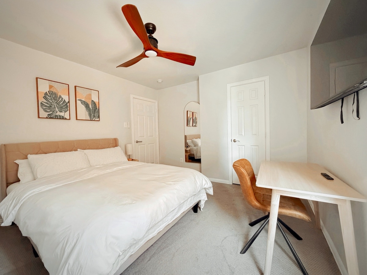 In Frisco Hills, this private suite near PGA Frisco golf, World Cup, Beach has a Full Kitchen, King Bed, Washer/Dryer, seasonal community Pool, Desk. Work-ready, attached unit with keypad entry & no shared indoor spaces. Includes dedicated workspace and monitor, fast Wi-Fi + Ethernet, & walk-in shower. Driveway parking, trails nearby. Perfect for golf trips, football/soccer, weddings/events, family-visits, weekends & extended-stays. Ideal for corporate/medical stays. Weekly & monthly discounts.