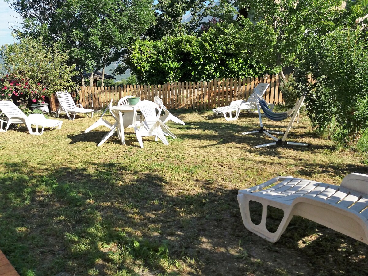 Logement entier, au calme, type T3, 2 chambres, places de parking privées juste devant (2-3), terrasse privée, jardin. A 8 min d'Embrun, 5 min du plan d'eau, 20 min de la station des Orres. Idéal pour couple avec enfants ou 2/3 couples. Maison composée d'une cuisine toute équipée qui donne sur un coin salon TV/salle à manger avec canapé-lit, 1 chambre avec 1 lit double, 1 chambre avec 2 lits simples (possible de les assembler), 1 salle d'eau avec sèche serviette et WC. torchons, savons café etc