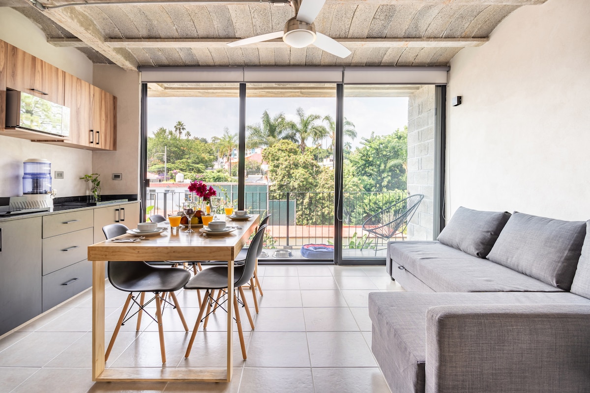 Ubicado a 10 minutos del Centro Histórico con las principales atracciones como la Plaza Principal llena de restaurantes y bares, Catedral, Jardín Borda u otras atracciones como el Palacio de Cortes o Balnearios. El conjunto es de solo 6 apartamentos con áreas comunes muy verdes. El apartamento cuenta con áreas únicas como Roof Garden y balcones privados. La estancia y recamara cuenta con todas las comodidades con ventiladores en techo y mosquiteros en ventanales lo que lo hace muy fresco.