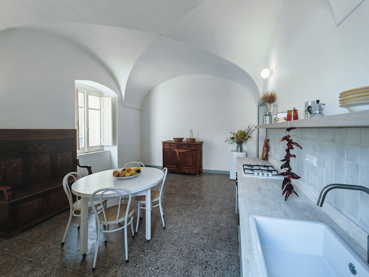 Casa Melograno is a three-story house with a charming small garden. The ground floor features a spacious kitchen, while the first floor includes a living room (which can also serve as a bedroom) and a bathroom. The bedroom on the second floor is accessible by a ladder. Casa Melograno has been tastefully renovated by us. Please note, it is not suitable for young children under 6 years old due to the lack of a banister on the stairs and the ladder leading to the top-floor bedroom.