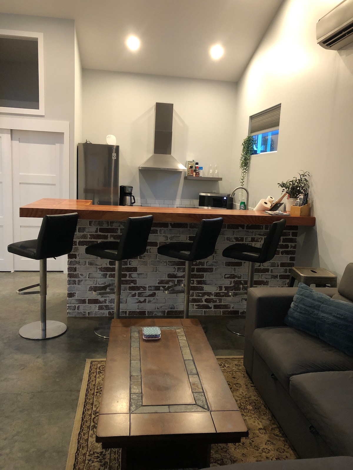 Situated one block off Cumberland’s Main Street and only a few blocks from parks, hiking and biking trails, this guest house offers easy access to all of what Cumberland has to offer. Featuring real wood, brick and concrete accents, this newly constructed guest house has two bedrooms. Each with a queen sized bed. The living room sofa bed will accommodate two more children or one more adult. The eat in kitchen has all appliances and a large bar that can accommodate up to 6 guests.