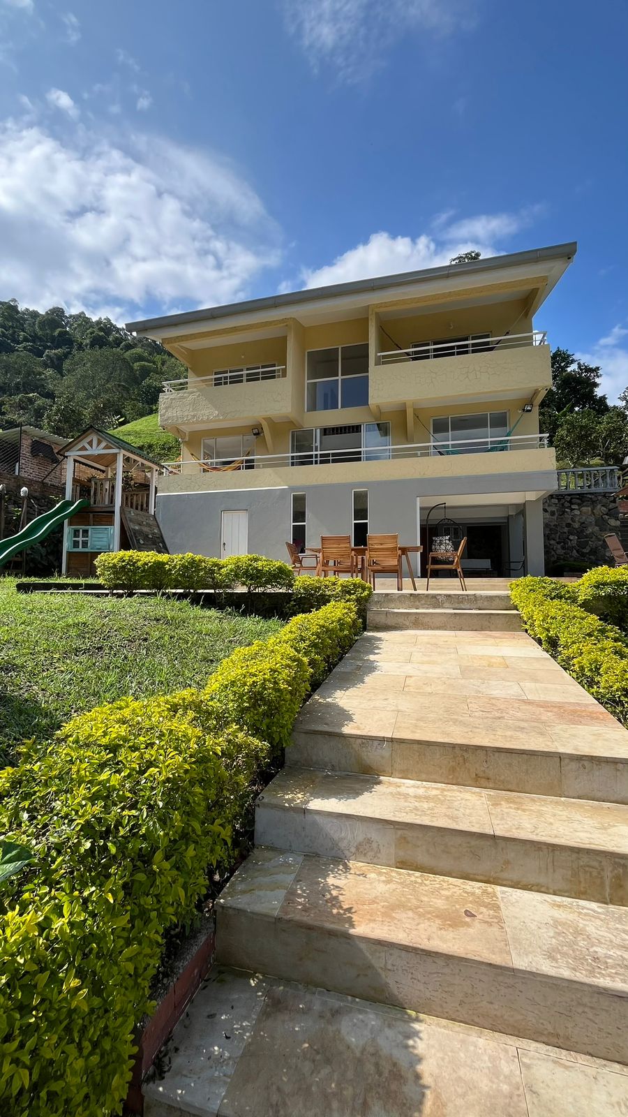 Disfruta de esta hermosa casa en La Vega con una vista increíble a las montañas y piscina privada. No está en conjunto, brindando mayor privacidad. Tiene 4 pisos conectados por escaleras (sin ascensor) y es ideal para familias. Cuenta con espacios para comer al aire libre, zona de BBQ, TV con internet en la sala y conexión WiFi en toda la casa. Es un espacio fresco y ventilado, por lo que no cuenta con aire acondicionado ni ventiladores.