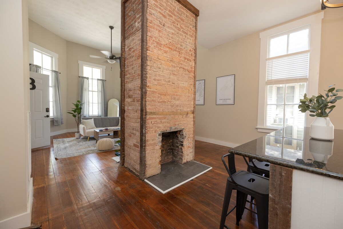 Encantador apartamento tipo casa de carruajes en el centro. ¡Nuevos suelos de madera en la sala de estar! A poca distancia a pie de servicios y atracciones, como rafting en aguas bravas y vida nocturna, y a solo 8-10 minutos de Fort Benning. ¡Hermoso patio cerrado! Situado justo detrás de nuestra casa personal histórica, este edificio fue el hogar original de los carruajes de la familia cuando no estaban en uso. Tenemos wifi de más de 300 velocidades, lavadora y secadora, y champú y acondicionador para tu primera noche.