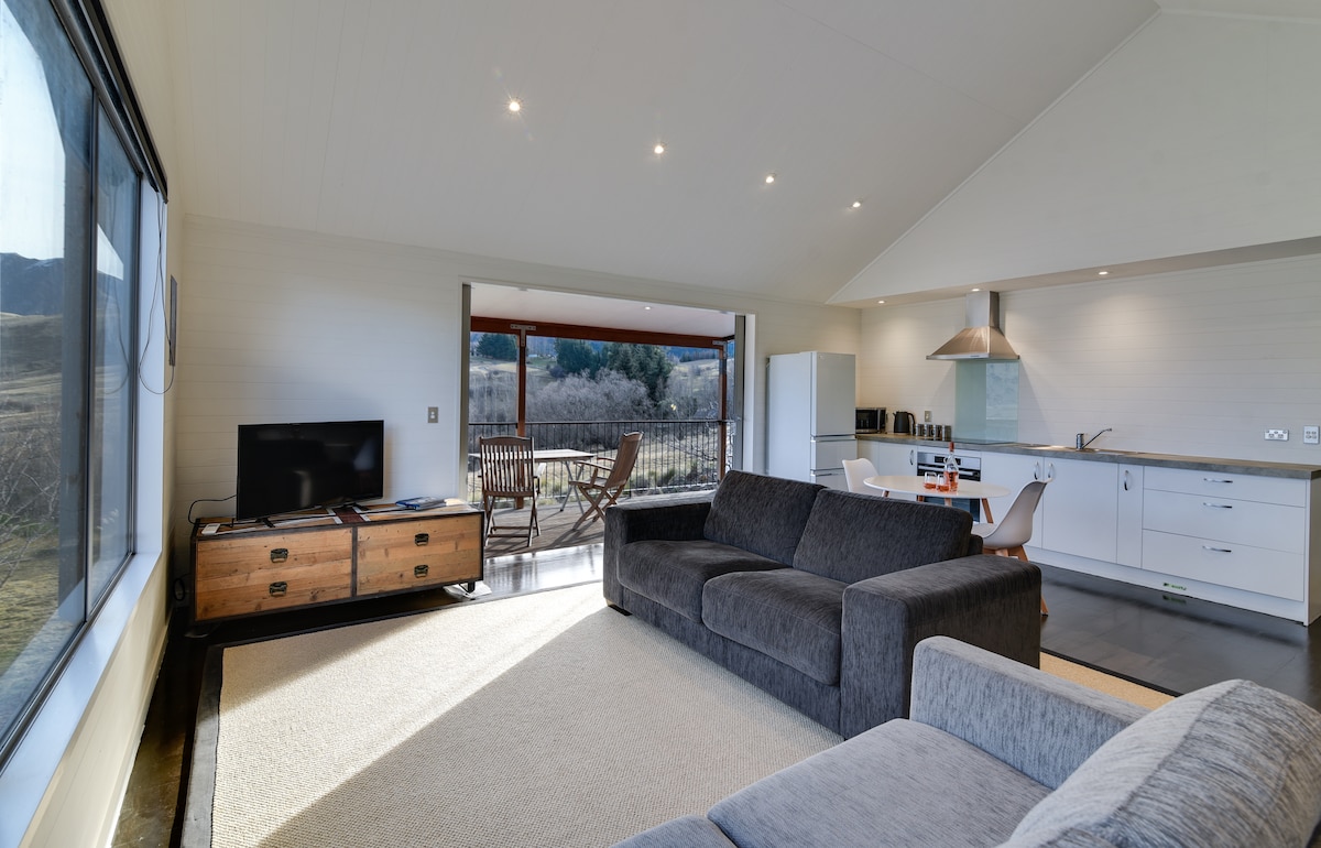 ¡Te damos la bienvenida a que vengas y te quedes en un hermoso pedazo de paraíso! Nuestra pequeña casa de diseño arquitectónico de la galardonada arquitecta Anna-Marie Chin está enclavada contra una hermosa roca de esquisto expuesta en un paisaje impresionante. Hay 3 acres de tierra para pasear y las vistas desde la tierra son impresionantes. El salón tiene ventanas altas en ángulo orientadas al norte que permiten tomar el sol todo el día y ofrece unas vistas impresionantes de las colinas más allá y del hermoso paisaje de Central Otago. Desde las puertas correderas oeste y el asiento de la ventana incorporado tienes unas vistas impresionantes de las Remarkables. El sendero de Queenstown está justo fuera de tu puerta, por lo que es un lugar fabuloso para caminar y montar en bicicleta. ¡Ven, quédate y compruébalo por ti mismo!