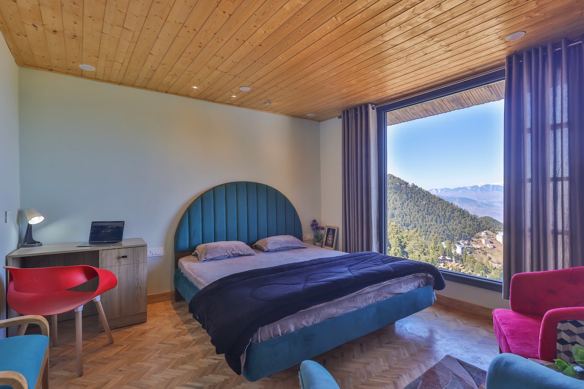 This Tiny house inspired studio, housed within a Victorian chalet, with its independent entryway and a private tiny lawn is sure to enthrall you. Be it the trending WFH requirements or freelancers on the move this place has been designed to cater for all. Furnished in cedar wood and whites, the studio reflecting eloquent modernity also preserves the typical mountain house elements. let yourself experience " House in a Room"