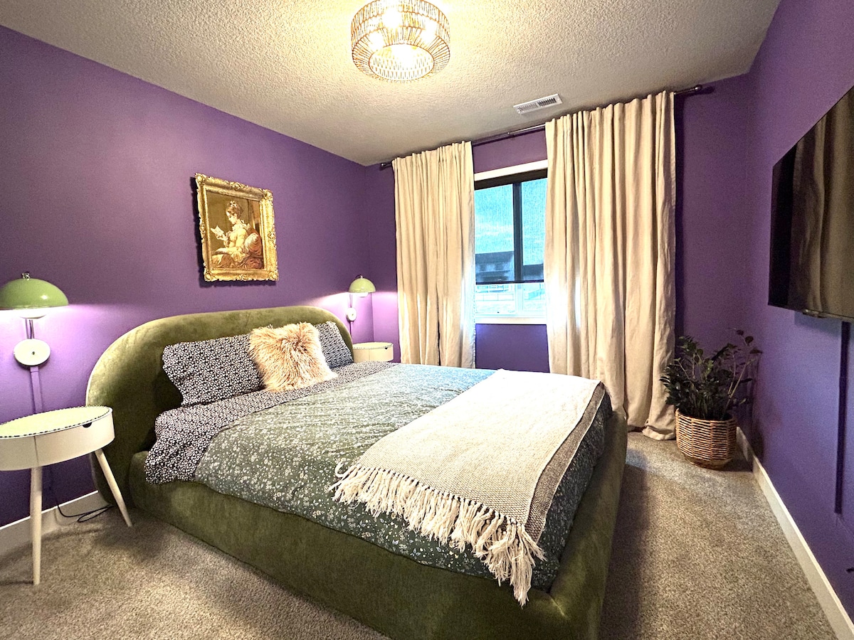 Siéntete como en casa y disfruta de un montón de espacio. Este espacioso lugar ofrece un patio totalmente vallado y un montón de estacionamiento en el camino de la unidad. El nivel principal tiene un dormitorio con cama tamaño queen y un medio baño. Arriba tenemos una suite King con ducha de baño completo y bañera. Además de eso, hay 2 habitaciones más, una con una cama tamaño queen y la otra con una litera doble. Segundo baño completo con bañera de ducha y lavandería. La quinta habitación está en el sótano con una cama de día doble con cama nido.
