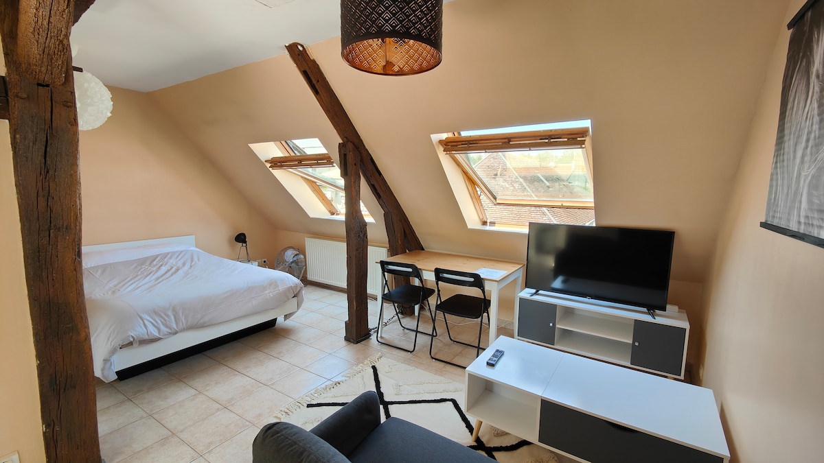 Disfrute de un alojamiento elegante, situado en el centro de la ciudad de Gien. - Estudio de 20 m2 totalmente renovado: - Con sala de estar, televisión, mesa base retráctil, mesa para comer u oficina, con un pequeño sofá de 2 plazas. - Una zona de dormitorio con una cama de matrimonio de 140 x 190 y un armario. - Un cuarto de baño - Cocina totalmente equipada Placa de gas de dos fuegos, horno, microondas, campana extractora, nevera cafetera ,hervidor de agua..) con vistas al Loira - Aparcamiento gratuito en la calle - wifi fibra