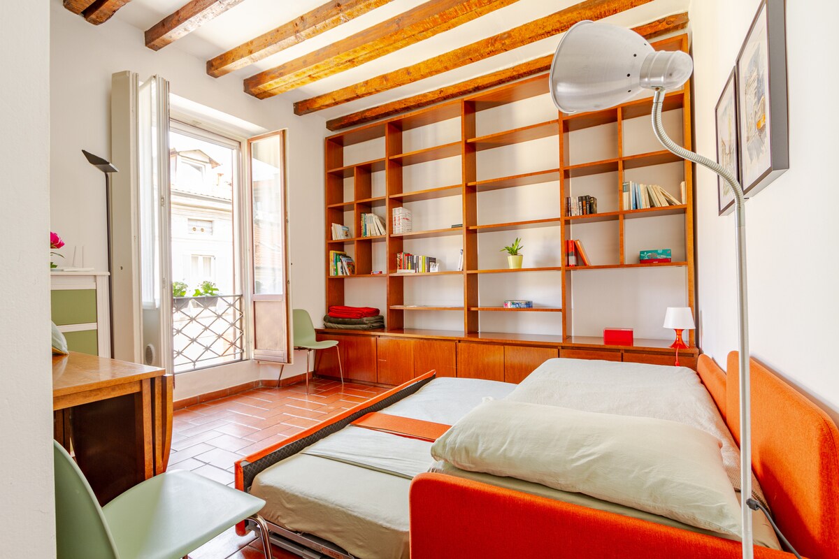 Grazioso monolocale nel centro storico, appena ristrutturato, con pavimento in cotto e travi a vista, molto luminoso grazie alle due grandi porte finestre. Perfetto per 2 persone grazie al divano letto a due letti separati che possono essere affiancati. Situato in una via tranquilla vicino alla Darsena e ai Navigli e ai bei negozi di Corso Genova e di Corso di Porta Ticinese. In 15 minuti si può raggiungere piazza del Duomo a piedi o con i mezzi pubblici. Riscaldamento e A/C autonomi.