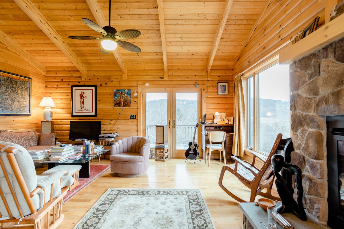 Encantadora casa de concepto abierto enclavada en las montañas Catskill, a 20 minutos al este de Oneonta. ¡Vistas exquisitas! (**Adyacente al circuito de motociclismo. No es visible, pero es ruidoso durante el día de 9:00 a 17:00, 4-5 días a la semana. Disfruta de una lectura matutina en nuestros cómodos sofás y sillones o acércate a la chimenea de gas por la noche. Explora nuestra propiedad de 20 acres o relájate en el amplio y soleado césped. La mesa y las sillas al aire libre junto a la chimenea son perfectas para una cena con vistas a las hermosas y antiguas montañas de Catskill.