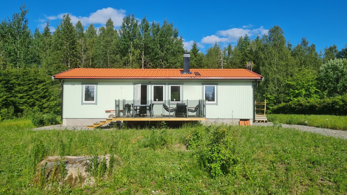 Casa de nueva construcción (2016) ubicada justo al lado del agua. Loft de 40 metros cuadrados+20 metros cuadrados y espacio al aire libre de 12 metros cuadrados (no aislado en invierno) La casa es muy luminosa y fresca, y tiene una vista increíble. Hay un dormitorio con una cama doble y un baño con ducha y lavadora. Hay un loft para dormir con 3 x 90 camas. Existe la posibilidad de pedir prestada la cuna de un niño. A 1 milla del centro de Karlskoga, donde hay restaurantes y tiendas. Tienda de comestibles más cercana a 4 km En la sala de estar/cocina puedes disfrutar de la vista, pero también disfrutar sentándote frente a la chimenea.