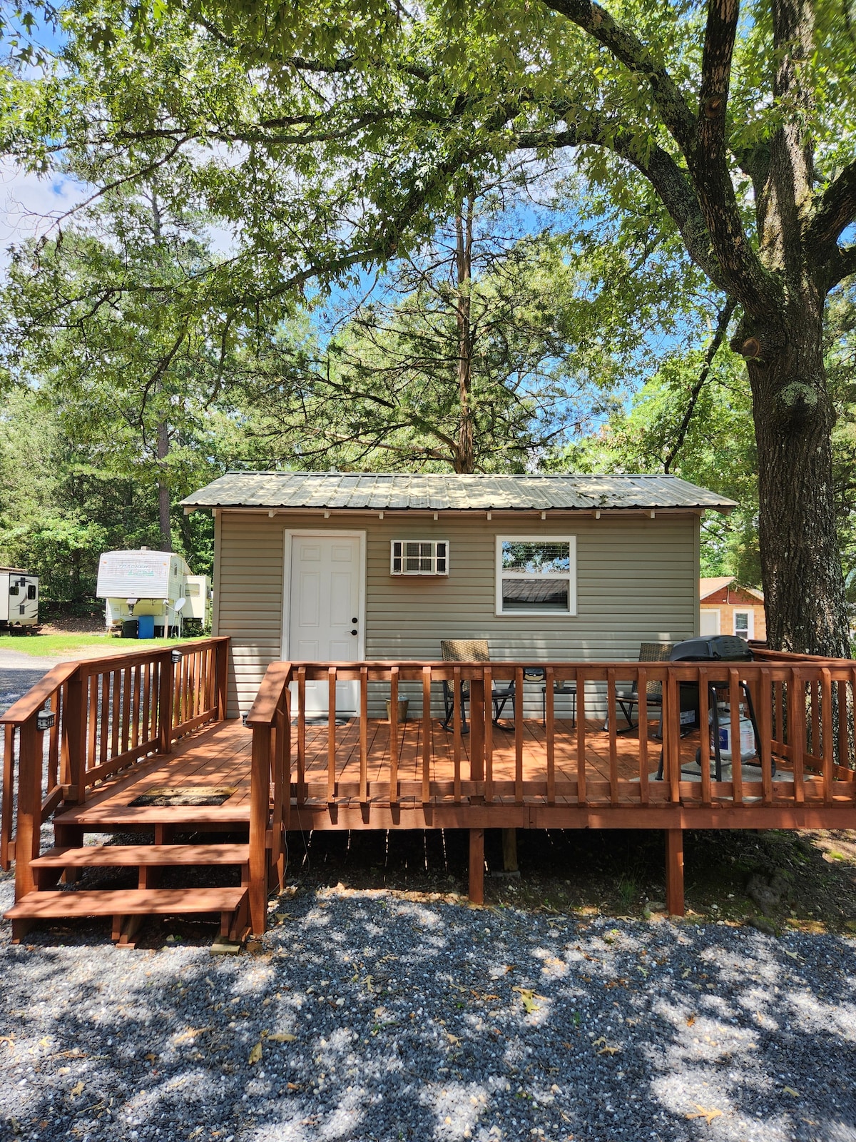 Come see what glamping is all about! Remotely located just 1 mile from DeGray Lake’s Lenox Marcus Recreation Area and boat ramp. The cabin sleeps up to 6 comfortably. RV rental also available on the same property with an additional fee of $75/night. Sleeps 3 comfortably. If not needed, the RV will remain vacant during your stay. PLEASE SPECIFY IF RV IS NEEDED WHEN BOOKING. Additional payment request for RV rental will be sent after booking. 30amp full hookup RV site also available $25/night.