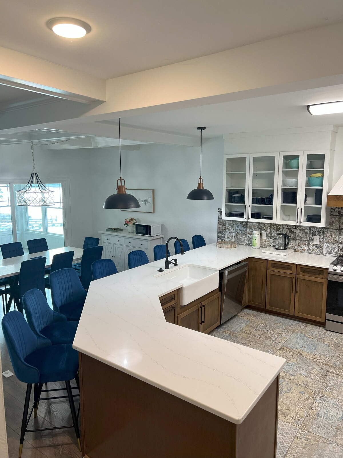 Frente al lago • 6 dormitorios • 4 baños • Capacidad para 18 personas • No se admiten mascotas Dock Holiday es una espaciosa granja de diseño con acceso directo a la playa y al lago, que incluye un bote exclusivo para los huéspedes. Con alojamientos de hasta 18 personas, es uno de los alojamientos de mayor capacidad en Chesnut Bay. Una enorme gran habitación y cocina abierta, esta última con electrodomésticos de acero inoxidable, armarios modernos y una isla de servicio de 9 pies y asientos de bar para 4 personas, disfruta de fabulosas vistas directas del lago. Una cena estilo granja