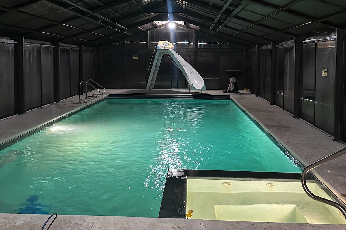 Enjoy a peaceful countryside retreat at this charming Barndominium set on 6.5 private acres, accommodating up to 8 guests This spacious getaway features an 18' x 36' private pool with a hot spa and a solar-heated pool room for year-round relaxation. The Great Room offers open-concept living with comfortable seating, recreation space, and four sleeper sofas. The cozy bedroom includes a king-size bed, while the fully equipped chef’s kitchen boasts an oversized island & a stove with an air fryer.