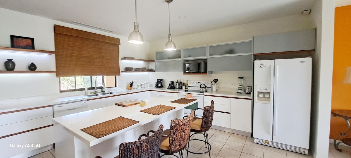 ¡Una de las mejores vistas al mar y a la montaña de Playas del Coco! ¡Damos la bienvenida a todos! Perfecto para parejas, familias y trabajadores remotos. Casa totalmente equipada, ubicada en la cima de una montaña dentro de una comunidad cerrada, a 10 minutos a pie de la playa. Tiendas de comestibles, restaurantes y tiendas cercanas. A poca distancia en coche del aeropuerto de Liberia (20 minutos). Disfruta de un concierto de pájaros y monos cada atardecer y amanecer, espectaculares vistas de las puestas de sol de Playas del Coco. ¡Cerca de la naturaleza, pero no muy lejos de los servicios!