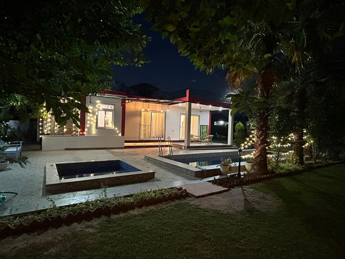 Un lugar genial para alojarse y divertirse. Es una granja de 3024 metros cuadrados (27216 pies cuadrados) con amplias habitaciones, piscina( 40 pies de largo * 20 pies de ancho * 3.5Ft - 6 pies de profundidad), un gran césped, Machaan y hoguera que puede sentarse fácilmente hasta 15 personas. Disfruta de una experiencia de visualización de televisión con proyector de 200 pulgadas al aire libre en el área de la cubierta de la piscina. Ven a actualizar de tu horario diario. Disfruta de la vida en el resort. Lo mejor para organizar fiestas de cumpleaños, vacaciones familiares, escapadas de ocio, retiros corporativos con mucho espacio para divertirse.