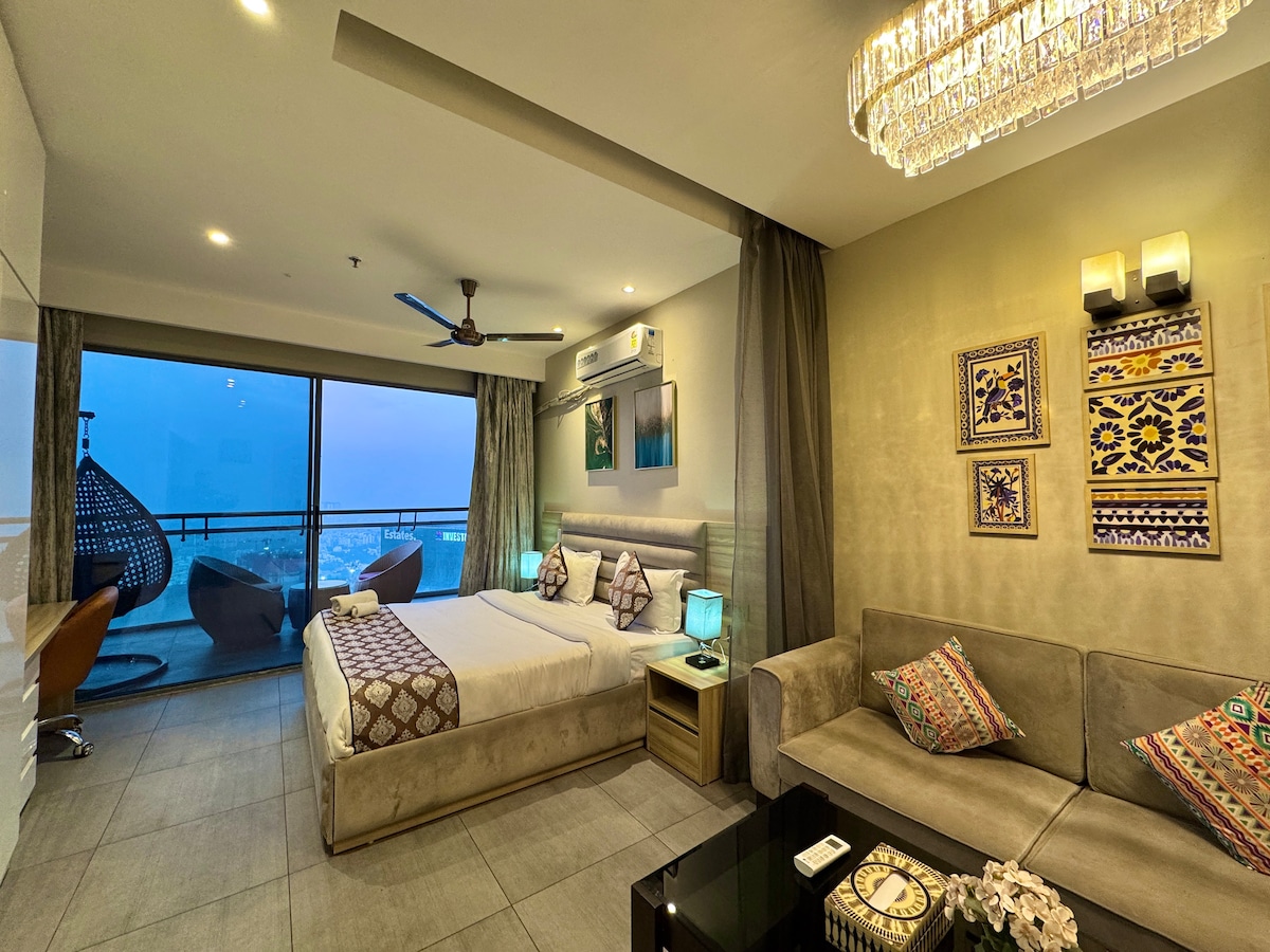 - Apartamento en el piso 31. - Entrega a la puerta disponible 24/7 - Swiggy Zomato y parpadeo - Acceso a Netflix / Prime / Youtube - Inmejorables vistas panorámicas al horizonte de la ciudad y más allá. - Cocina totalmente equipada con todo lo necesario para cocinar y cenar. - Wifi rápido de 200 Mbps, seguridad disponible las 24 horas, los 7 días de la semana. - Ubicación privilegiada en el corazón de la ciudad, cerca de los mejores restaurantes, tiendas y atracciones. - Perfecto para parejas, viajeros solitarios, viajeros y familiares que buscan una estancia de lujo e inolvidable.