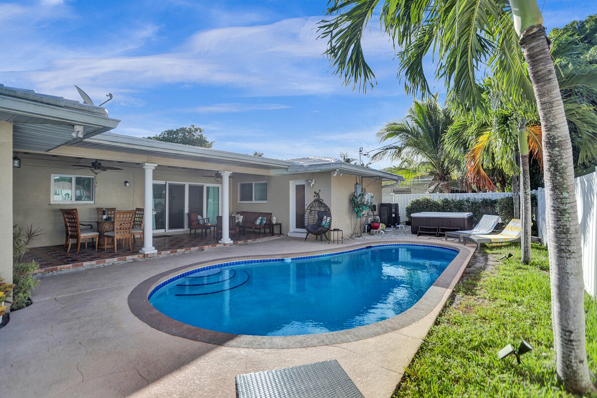 Impresionante villa en un barrio tranquilo rodeado de palmeras, con un espacio habitable de concepto abierto, 3 dormitorios, 2 baños, cocina de chef totalmente equipada con electrodomésticos de primera línea, comedor cubierto interior y exterior y zona de descanso, espacio de oficina, piscina climatizada, jacuzzi al aire libre, parrilla para barbacoa y mucho más. A 10 minutos del océano, a 15 minutos del aeropuerto FLL, cerca de los lugares más emocionantes de FLL. Publix, Starbucks, CVS a solo 5 minutos. ¡Estamos deseando recibirte!