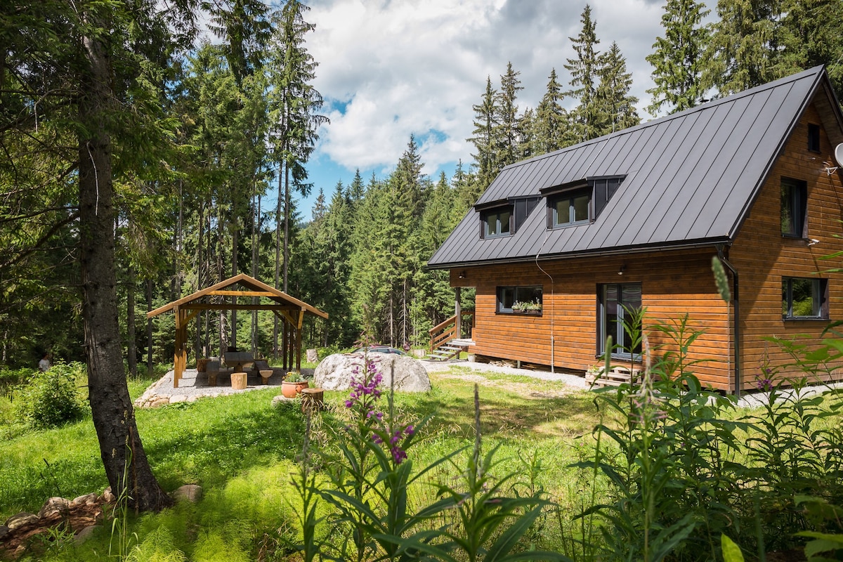 Disfruta de tu momento de paz en el campo con una hermosa vista de los Low Tatras en una minicasa de diseño a solo 10 minutos en coche de las pistas de esquí del centro de golf Tale.